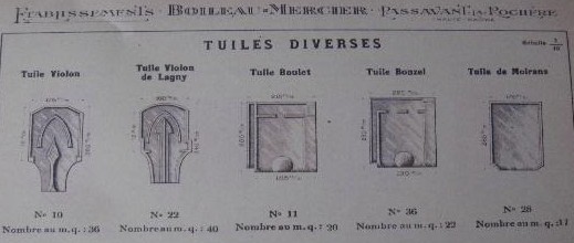 Un extrait du catalogue des établissements Boileau-Mercier fait état d’une ‘’tuile violon de Lagny ‘’ référencée sous le N° 22. Il semblerait que celle-ci soit inspirée de celle fabriquée en Cote d’Or à Lugny près de Leuglay dans la tuilerie de la famille Landel. Celle référencée sous le N° 10 a une typologie bien spécifique avec ses secteurs rectilignes en partie supérieure et n’ a été semble t-il produite que par ce fabriquant. La famille Boileau-Mercier était propriétaire de la tuilerie des Forges et de la tuilerie de la Nava. La première était nommée ainsi car elle remplaça les Forges à partir de 1848. Vaste et belle construction sur le ruisseau de la Rochère, elle occupait 35 à 40 ouvriers. Elle a été détruite dans les années 80. La seconde est devenue propriété de la famille vers 1901 et fonctionna jusqu’à la deuxième guerre mondiale (1939)